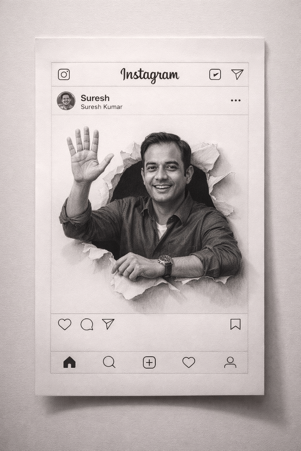 A hyper-realistic 8k photograph, captured with a 50mm lens and softbox studio lighting, showcasing a highly detailed 3D drawing on a pristine white piece of paper. The paper is cut and designed to perfectly mimic the interface of an Instagram post, centered on a slightly darker, plain white background. The top of the Instagram frame features the “Instagram” logo in its classic script, an Instagram camera icon, and a direct message paper airplane icon, along with a three-dot menu. Below this, a circular profile picture icon displays a miniature drawing of a smiling person, accompanied by the username “Suresh” and the name “Suresh Kumar”. The central area of the Instagram post features a meticulously drawn, hyper-realistic depiction of a man, from the waist up, appearing to burst through a dramatically torn hole in the paper. The torn edges of the paper are rendered with incredible depth and shadow, creating a convincing trompe l’oeil effect of a three-dimensional rip. The man is smiling broadly, with his right hand raised in a friendly wave, and his left arm resting casually on the torn edge of the paper. He is wearing a dark, long-sleeved collared shirt and a dark watch on his left wrist. The character’s face is uploaded face as reference. The bottom of the Instagram frame includes the iconic like, comment, share, and save icons, followed by the navigation bar with home, search, add post, reels, and profile icons. The entire artwork exhibits exceptional pencil art technique, with intricate shading and highly detailed textures that give the illusion of a real person interacting with a paper interface, enhanced by cinematic lighting that emphasizes the depth and realism of the 3D drawing.