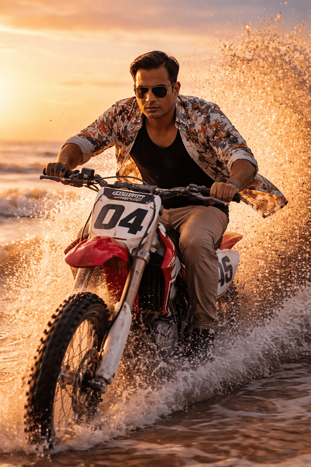 A dynamic photograph captures the man from image_0.png in the exact same pose, riding the red and white dirt bike with the number ’04’ on the front plate through the surf on a beach at sunset. His body is leaned forward, arms gripping the handlebars, as a massive, circular spray of water erupts around the rear and sides of the motorcycle, illuminated by the warm, golden light. He wears the floral open shirt, black tank top, beige pants, and sunglasses as seen in the reference. The ocean and pastel sky are in the background. Size 4:5 ratio 100% use my upload reference image image generate