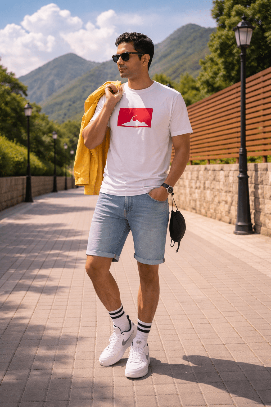 A full-body photograph of the young man from image_0.png, holding the exact same pose, standing on the paved walkway. He is wearing the white t-shirt, light blue denim shorts, white sneakers with black striped socks, sunglasses, and black watch, with the yellow jacket draped over his right shoulder and holding a black mask in his left hand. His head is turned to the left, looking away. The wooden slat fence, black street lamps, and stone wall are behind him. In the background are large green mountains and a bright blue sky with fluffy white clouds. The lighting is sunny and natural.