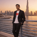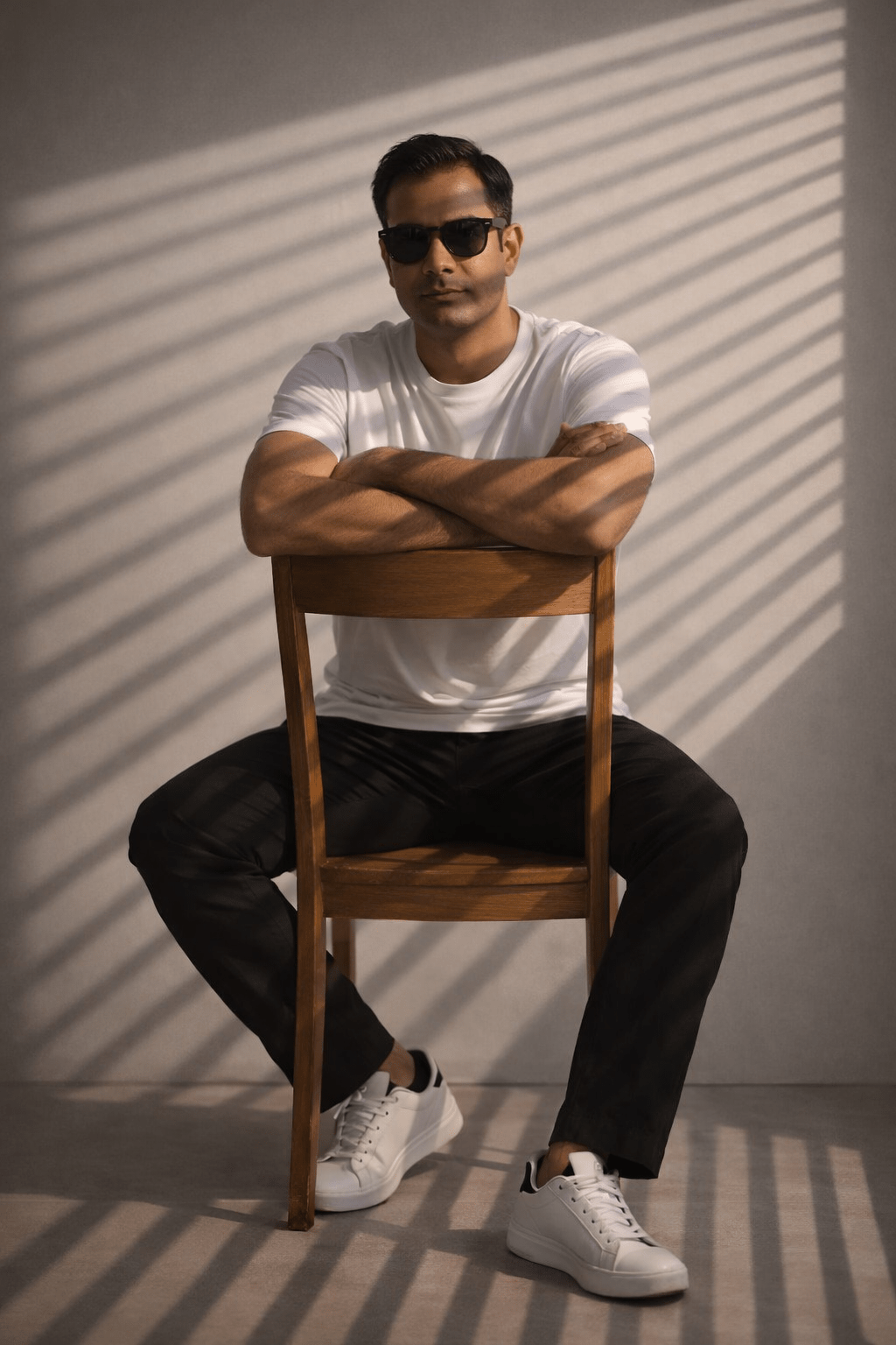 A full-length portrait of a young man with dark hair and sunglasses, wearing a white t-shirt and black pants, sitting backwards on a wooden chair. His arms are crossed over the chair’s backrest, looking at the camera. Strong directional light casts distinct horizontal striped shadows across his body, the chair, and the neutral grey wall behind him, matching the exact pose and lighting in image_0.png. He wears white sneakers with black accents quality 8k size 4:5 ratio image generate