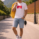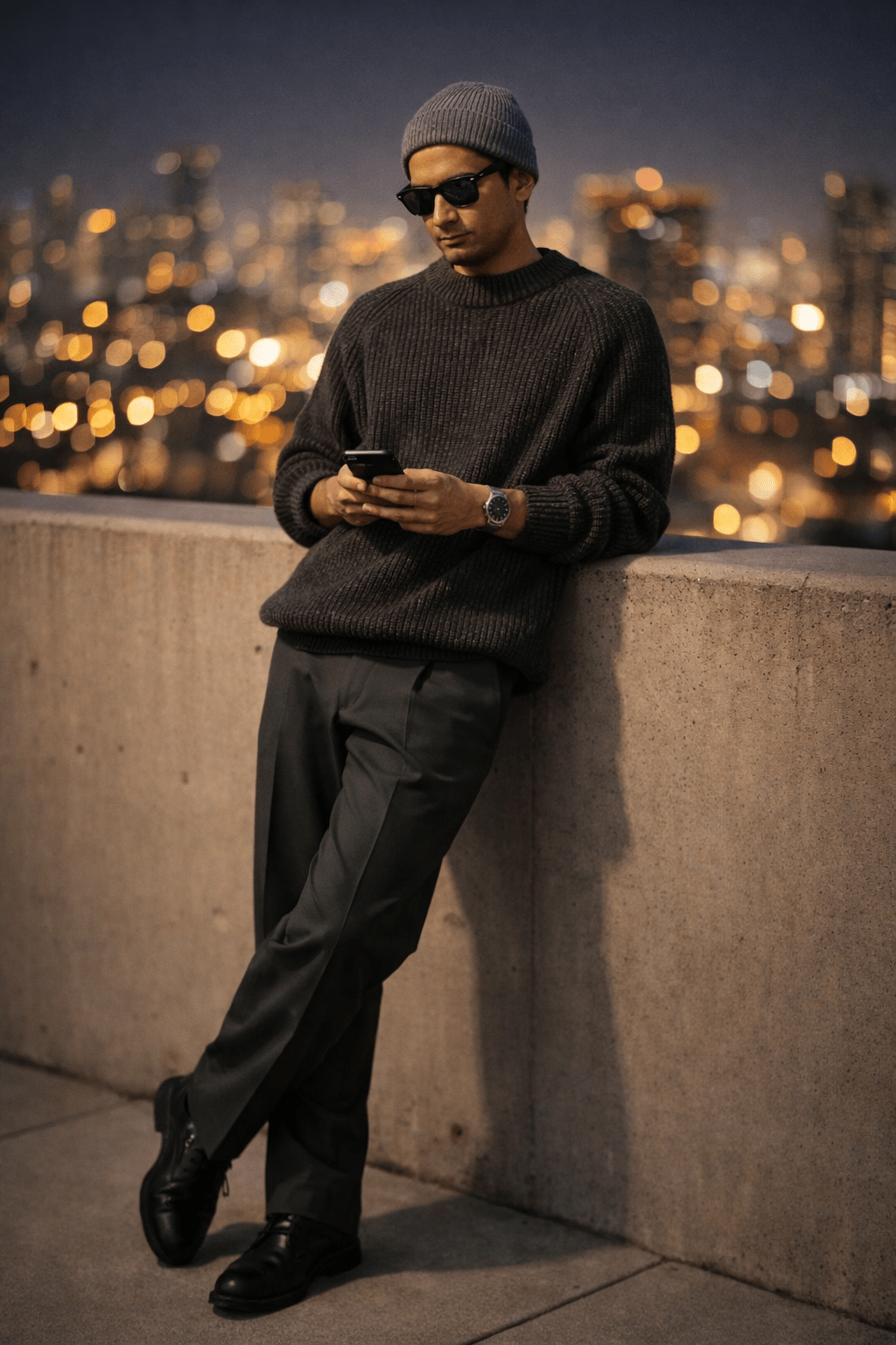 “A hyper-realistic full-body portrait of a handsome young man leaning casually against a concrete ledge at night. He is wearing a grey ribbed-knit beanie, black wayfarer sunglasses, and an oversized dark grey chunky-knit sweater. He is dressed in dark green wide-leg trousers and black leather shoes. His pose is relaxed, leaning back with one leg slightly crossed, holding a smartphone in both hands at waist level. A silver watch is visible on his left wrist. The background is a stunning cityscape at twilight with heavy bokeh (blurred city lights) in warm yellow and orange tones, contrasting with the cool tones of his outfit. Shot on a Sony A7R IV, 85mm lens, f/1.8 aperture, sharp focus on the subject, soft cinematic lighting, 8k resolution size 4:5 ratio 100% use my upload reference image image generate