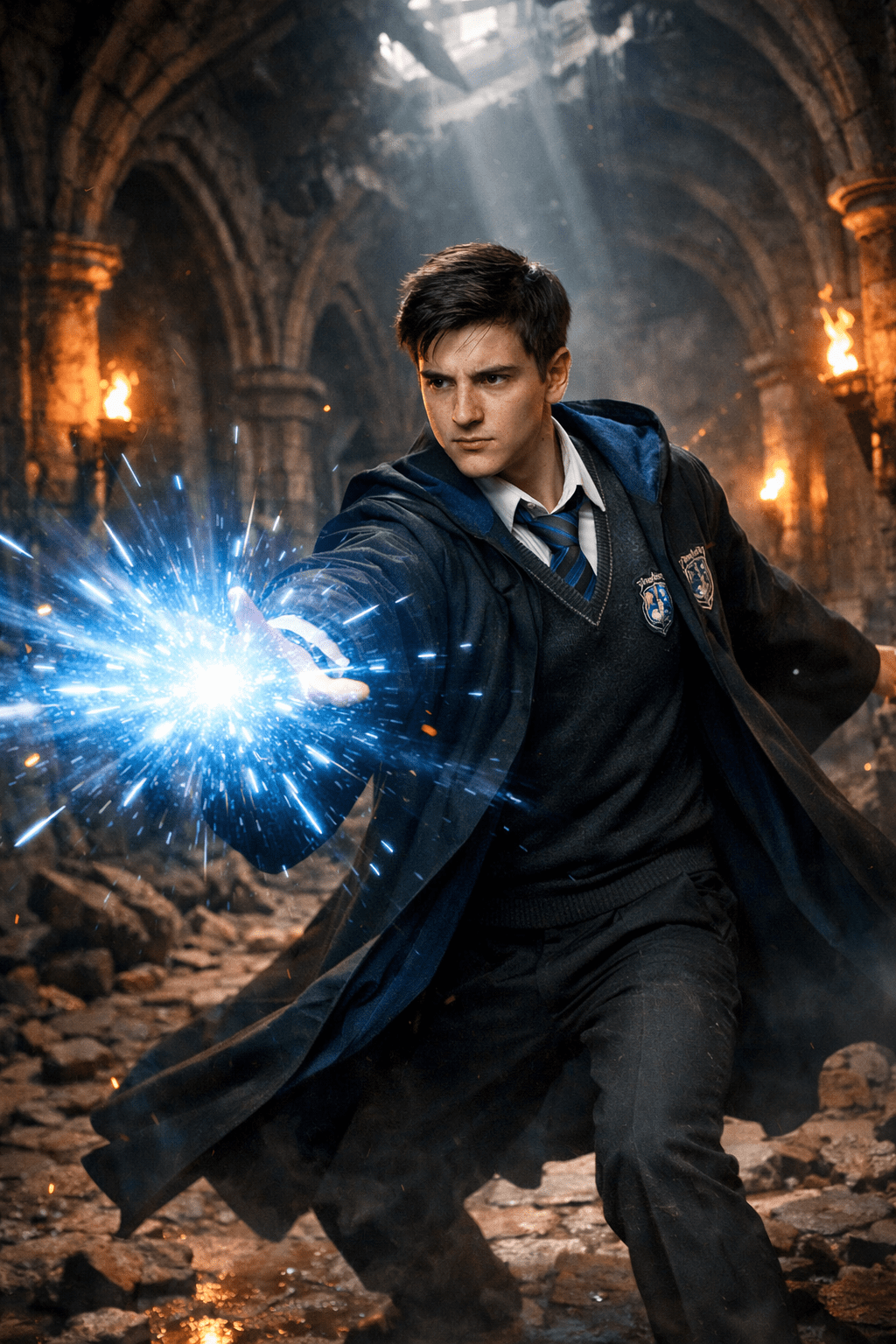 Ultra-realistic cinematic fantasy action scene, 8K resolution, vertical 4:5 composition. A young male wizard stands in a dramatic defensive stance inside a ruined gothic stone corridor with broken arches, scattered debris, cracked floor, and burning wall torches casting warm flickering light. He wears a dark blue magical academy robe with a crest on the chest, white shirt, tie, and formal trousers underneath. Neatly styled short dark hair, clean youthful face, focused intense expression looking slightly sideways. One arm extended forward casting a powerful glowing blue magical energy burst with sparks, light streaks, and electric particle effects radiating outward. Coat flowing naturally with motion. Atmospheric dust, cinematic depth of field, volumetric lighting from above through collapsed ceiling, high detail textures, photoreal skin rendering, dramatic fantasy movie lighting, sharp focus, HDR, epic cinematic color grading, hyper-detailed environment, realistic shadows, professional VFX style.