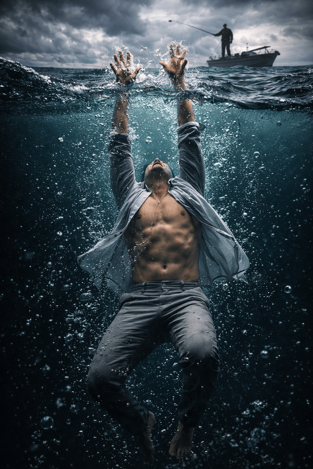 A man, fully submerged underwater as seen in image_0.png, with his head tilted far back and mouth slightly open, reaches his hands powerfully upwards towards the turbulent water surface. His grey shirt is open, revealing his torso and chest, and his light grey pants are wet. His entire body is arched dynamically, suspended in the dark water filled with many bubbles, as his hands break the waterline, creating a splash. The dark, stormy sky and a small fishing boat with a fisherman are visible above the water. Size 4 5 ratio Quality 8k 100% use my upload reference image image generate