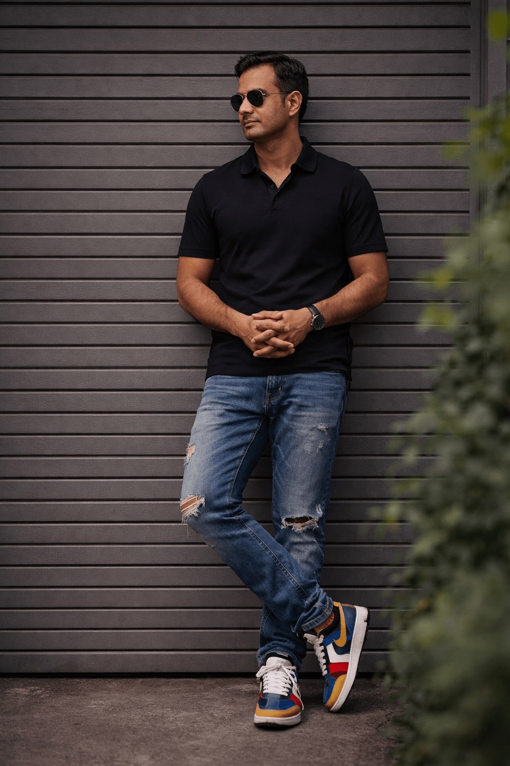 A full-body photograph shows a man in a black polo shirt, blue distressed jeans, and white sneakers with red and blue accents, leaning casually against a large grey slatted metal garage door, just as in image_0.png. His legs are crossed at the ankles, and his hands are clasped together in front of his waist. He wears sunglasses and looks to his right. Green foliage is blurred in the foreground on the right. Size 4:5 ratio 100% use my upload reference image image generate