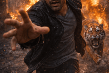Prompt Ultra-realistic cinematic action scene, vertical 4:5 composition. A rugged, handsome young man with thick styled dark hair, a sharp beard, and intense focused eyes is running directly toward th...