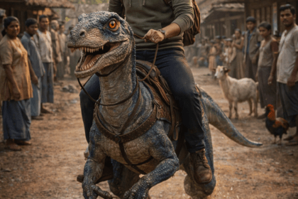Prompt “Ultra-realistic cinematic fantasy scene, vertical 4:5 composition. A handsome young man with styled dark hair and light stubble is riding a small blue velociraptor through a tropical village s...