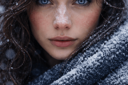 ChatGPT / Google Gemini / Meta AI Promte A hyper-realistic extreme close-up portrait of a woman, mirroring the pose and composition of image_0.png. Her piercing blue eyes gaze directly at the viewer. ...