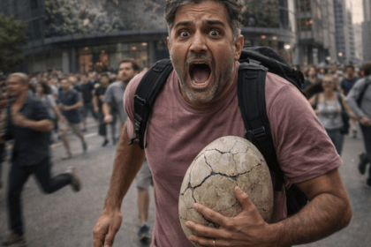 Google Gemini / Meta AI / ChatGPT Promte Ultra-realistic cinematic action photograph of a chaotic modern city street scene captured at eye level. In the foreground, a middle-aged man with salt-and-pep...