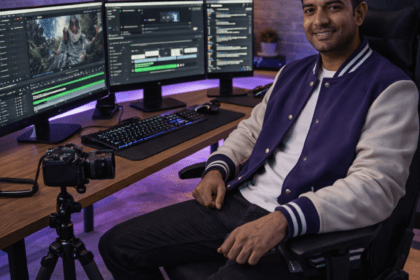 Google Gemini / Meta AI / ChatGPT Promte A professional gaming and content creation setup in a cozy modern studio room. The space features an L-shaped wooden desk with black metal legs, holding three ...