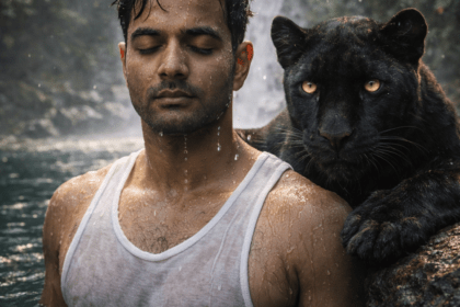 #trinding Promte Ultra-realistic cinematic fantasy scene of a mysterious young South Asian man emerging from a crystal-clear jungle pool beneath a powerful waterfall. He is wearing a wet white sleevel...