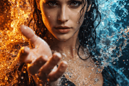 Google Gemini / Meta AI / ChatGPT Promte A close-up portrait of a woman with wet, dark hair, her face and shoulders covered in splashing water and golden fire-like liquid. Her right hand is reaching f...