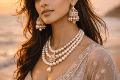 Design a hyper-realistic image featuring a model dressed in a soft pastel lehenga, adorned with multi-strand pearl necklace, pearl jhumkas, and matching matha patti. The location is a serene beach dur...
