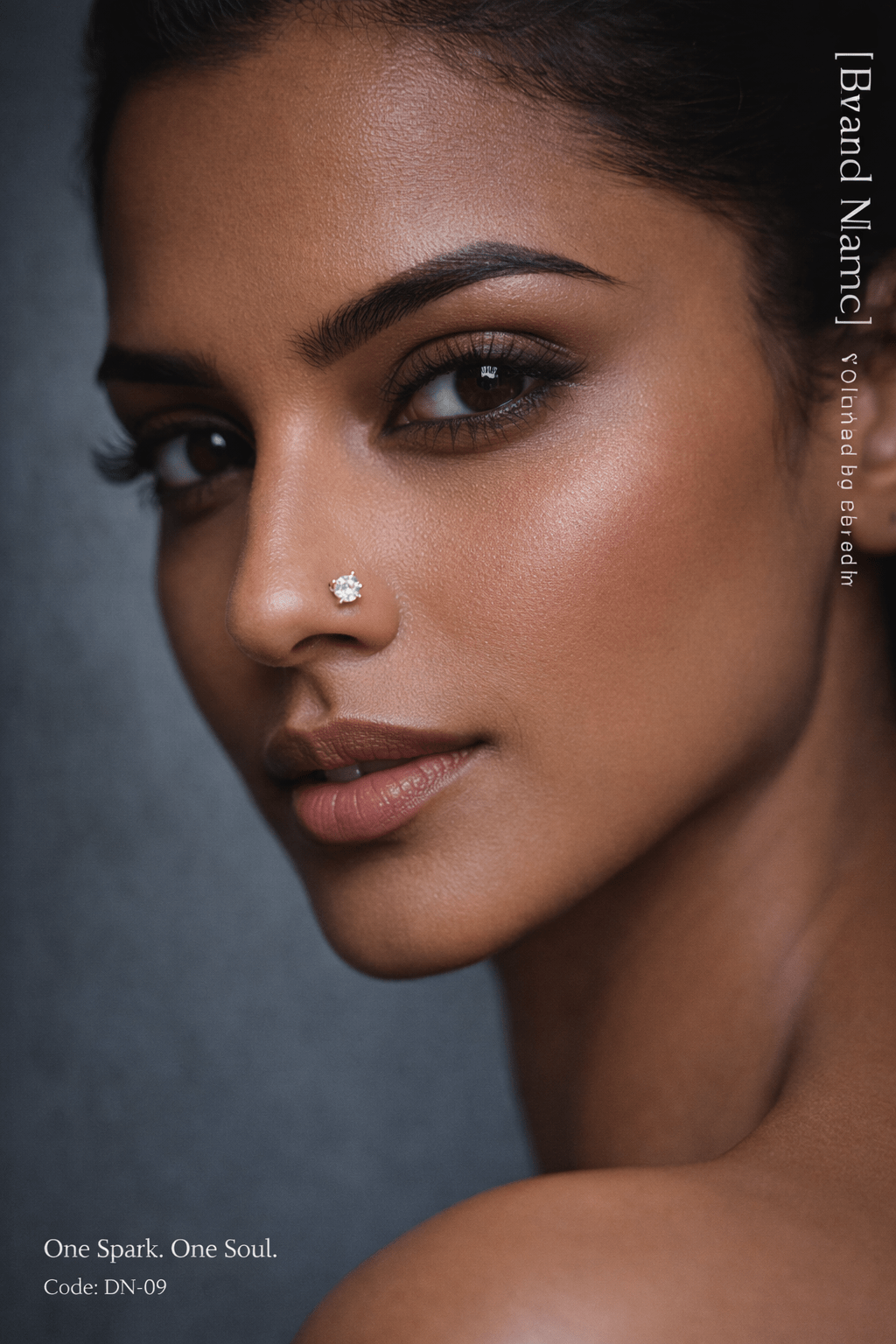 Generate a close-up hyper-realistic portrait of a dusky-skinned model wearing a single solitaire diamond nose pin. Use a Fujifilm GFX100 II medium-format camera with an 80mm f/1.7 lens at a 15° tilt f...