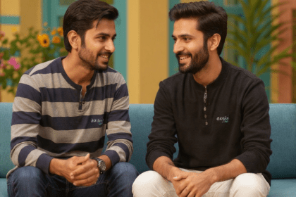 Google Gemini/ Meta AI Promte Generate a portrait of a young man sitting on the front sofa of the Kapil Sharma Show set next to him Shraddha kapoor sit, Kapil Sharma sitting on left sofa as he ask him...