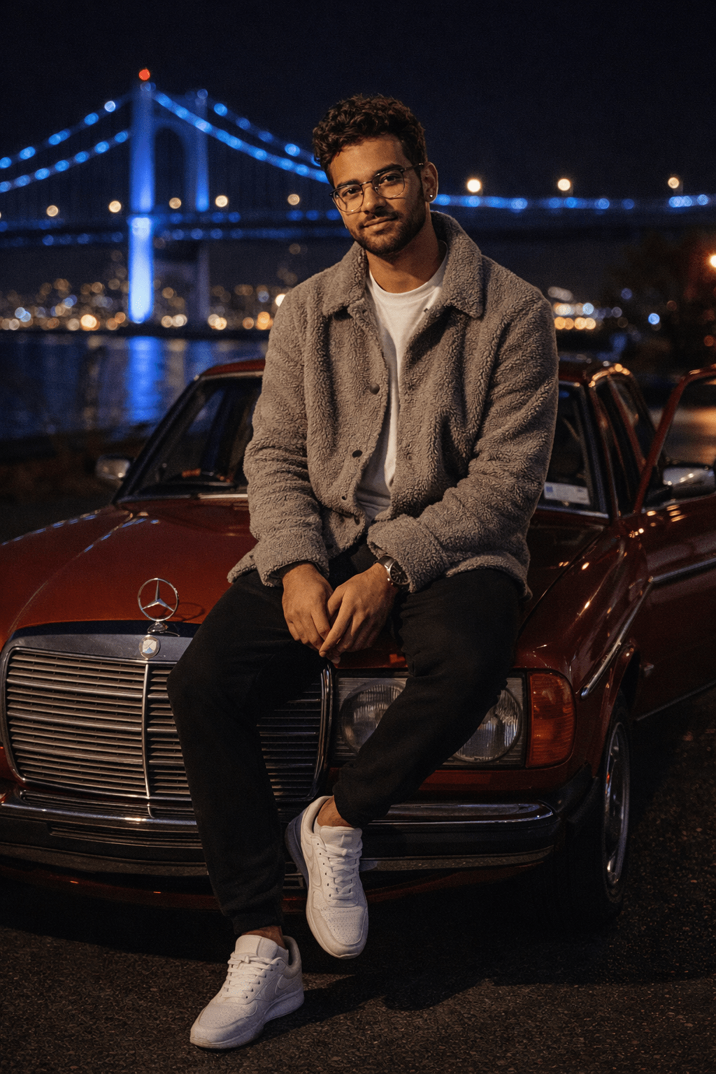 A young man with curly brown hair and glasses, wearing a grey shearling button-up jacket, white t-shirt, black joggers, and white sneakers, is sitting casually on the hood of a classic red Mercedes-Benz sedan. He is looking directly at the camera with a slight smile. The car door is open. The scene is outdoors at night, with a large, blue-lit suspension bridge and city lights reflecting over a body of water in the background. The asphalt is dark, and the lighting is a mix of city lights and street lamps. Size 4:5 ratio 100% use my upload reference image image generate