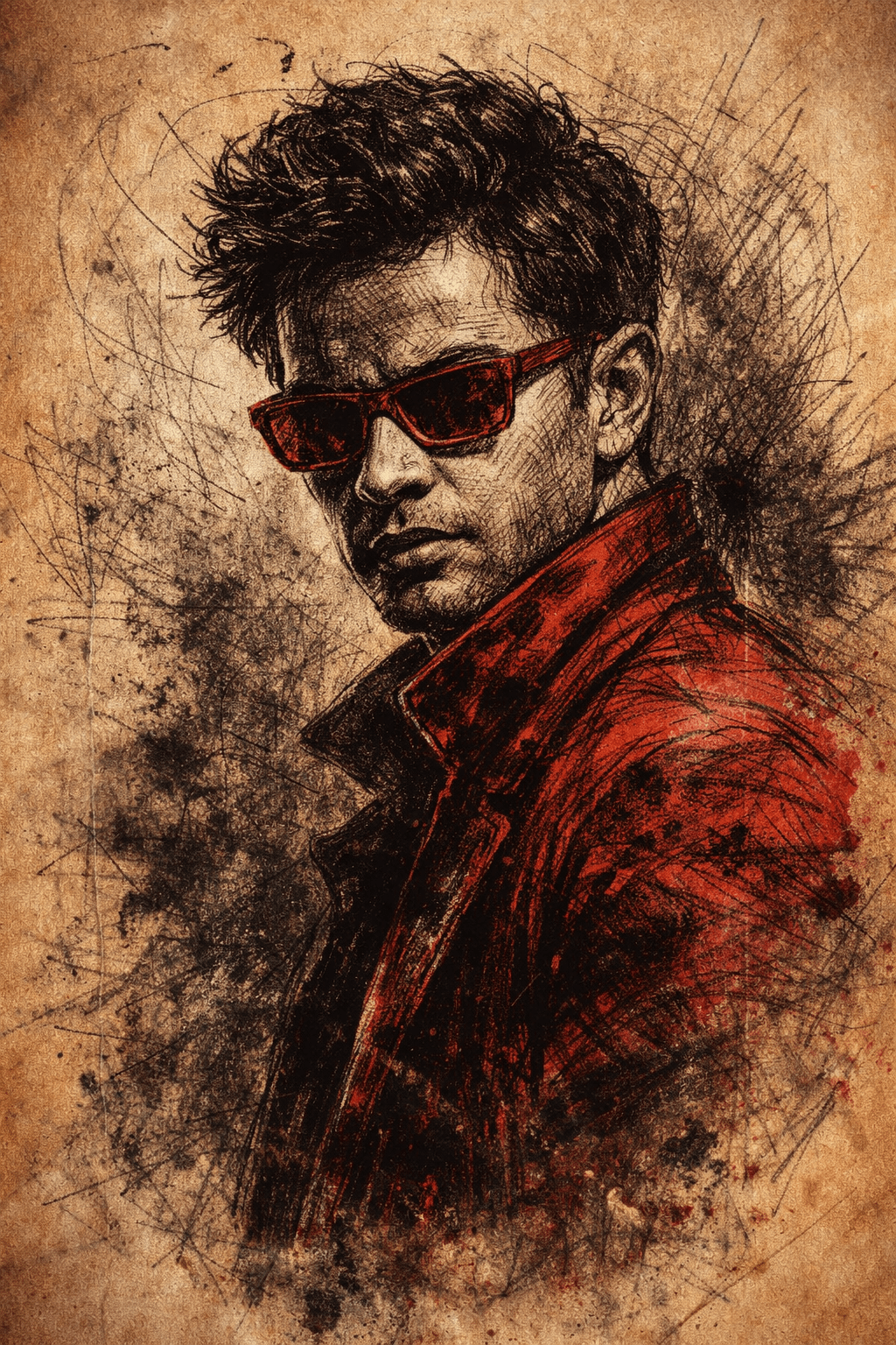 A rough hand-drawn grunge portrait of a confident man wearing bold red sunglasses and a red jacket, expressive cross-hatching pencil sketch style, dramatic shadows, intense expression, messy textured hair, artistic chaotic linework background, warm vintage paper texture, charcoal and ink strokes, high contrast, cinematic lighting, illustrative poster art, moody atmosphere, muted tones with deep reds, ultra detailed sketch aesthetic, artistic composition, hyper-stylized portrait.