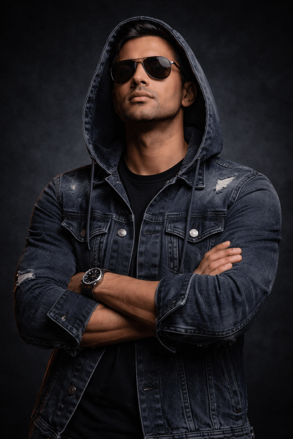 A portrait photo of the man from image_0.png, holding the exact same arms-crossed pose. He wears the dark grey denim hooded jacket with distressed details and silver buttons over a black t-shirt, and dark sunglasses. His head is slightly tilted upwards with a serious expression under the hood. The lighting is dramatic and moody, highlighting the textures of the denim and his face against the dark, textured studio background, as seen in image_0.png quality 8k size 4 5 ratio image generate