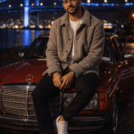 Ultra-realistic indoor portrait of a man seated on the floor against a wall, relaxed slouched posture, one leg up, one folded, arms resting loosely. Face turned sideways with a quiet, reflective expression. Strong warm yellow window light creating cross-shaped shadows on the wall. Minimal outfit, soft textures, cinematic color grading, grainy film look, moody atmosphere, DSLR photography, vertical 4:5 composition. 100% use my upload reference image image generate
