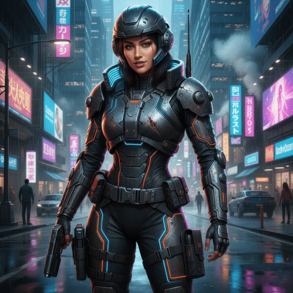 Using the reference uploaded image, create a fully realized bounty hunter in a cyberpunk style, featuring confident, cunning, battle-worn armor, set in neon-lit city streets, with dramatic lighting, high contrast, cinematic color grading, AAA game-quality character design