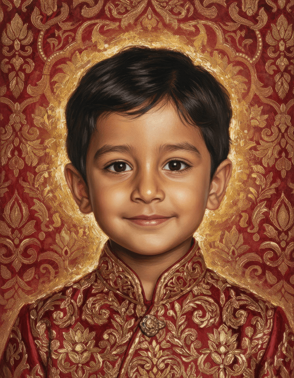 Use the uploaded image and create an exquisite oil painting of a storybook child in the style of, featuring ornamental textured patterns with layered gold accents and soft radiant interior lighting, high-quality fine art, vibrant gilded golds and rich crimson tones.