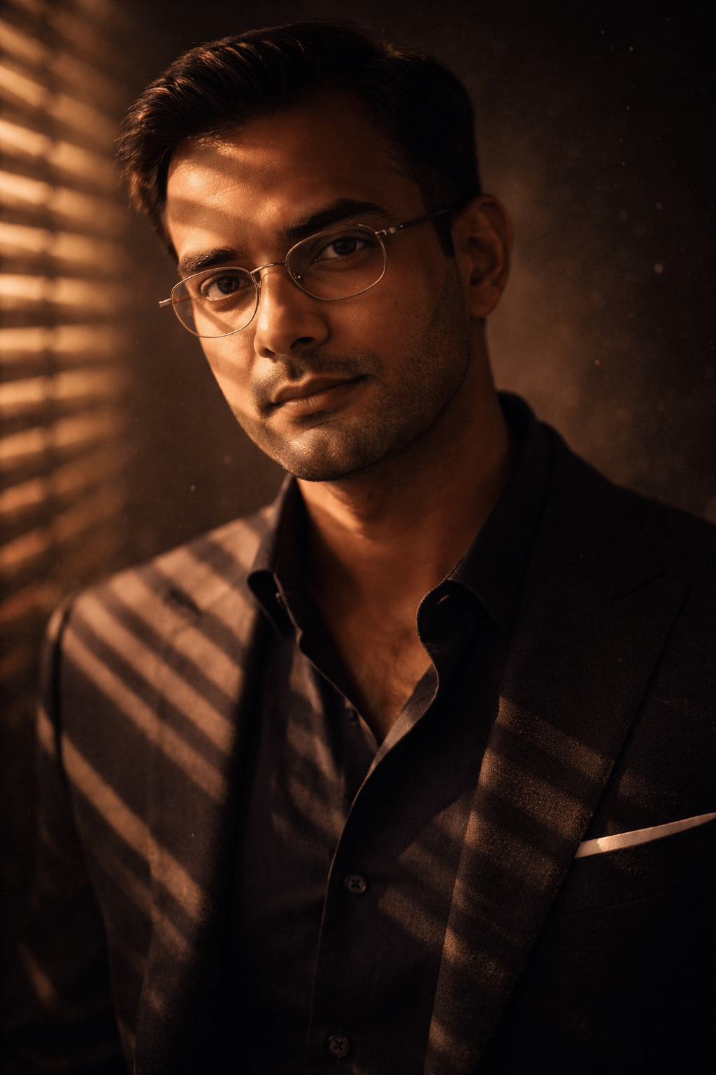 “Ultra-realistic cinematic portrait of a young man facing the camera, head slightly tilted, calm intense expression. He is wearing thin metal eyeglasses, short styled hair, light beard. Warm golden light passes through window blinds, casting dramatic striped shadows across his face and chest. Dark moody background, rain particles in the air, high contrast lighting, sharp facial details, shallow depth of field, 8K, cinematic photography. size 4 5 ratio 100% use my upload reference image image generate