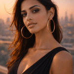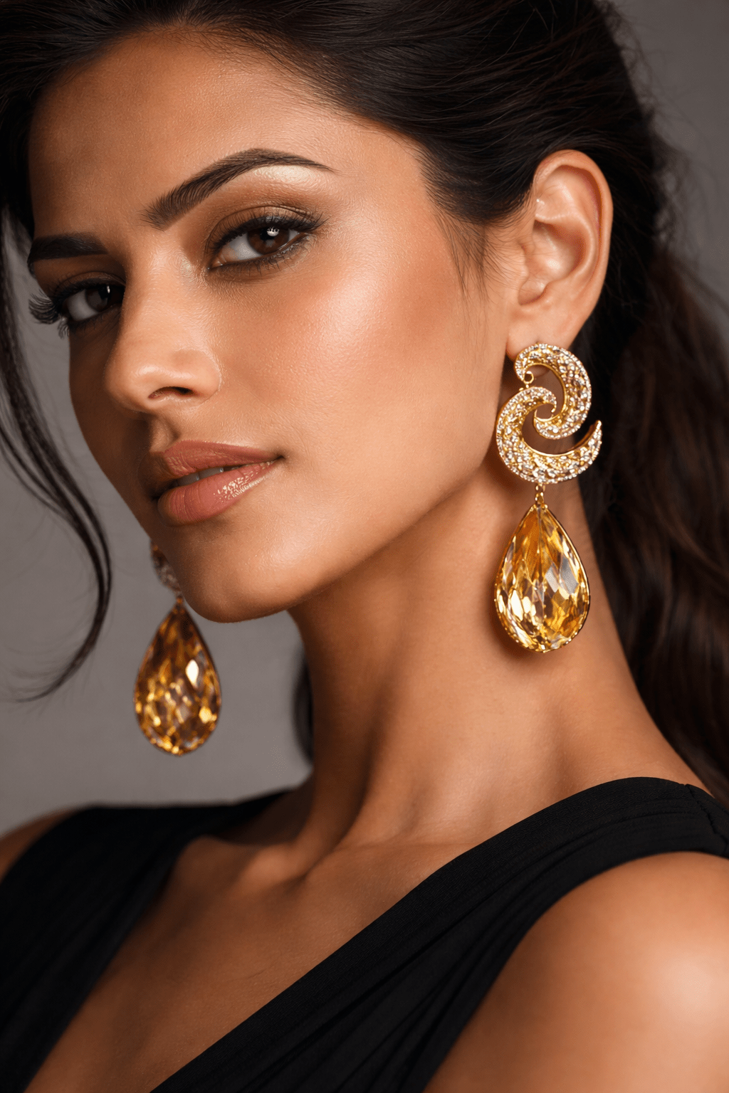 The model is wearing an elegant black top and elegant gold earrings. The earrings take all the attention and are in the centre of the photo. A close-up of the earrings is the centre of attention. This high quality studio shot shows the exquisite details of Giorgio Armani luxury fashion acces-sories. The model has dark hair and discreetly groomed make-up