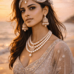 Generate a close-up hyper-realistic portrait of a dusky-skinned model wearing a single solitaire diamond nose pin. Use a Fujifilm GFX100 II medium-format camera with an 80mm f/1.7 lens at a 15° tilt from eye level to highlight the cheekbone structure and reflect diamond clarity. Lighting should include a soft frontal fill with a cool-tone beauty dish and subtle backlight that adds a soft halo around the model’s face. Backdrop: minimalistic textured concrete wall with gradient lighting from slate gray to steel blue. The diamond should show internal refraction and realistic sparkle with ultra-sharp clarity. Model makeup should be nude-toned, and her hair swept back into a clean bun. Zoom in close enough that only her eyes, nose, and lips are in frame. Place brand name vertically on the right edge: “[Brand Name] – Defined by Details.” Bottom left corner includes tagline: “One Spark. One Soul. Code: DN-09.” Ideal for use in minimalist print campaigns or cinematic IG Reels cover photos. Mood: sharp, intimate, premium.