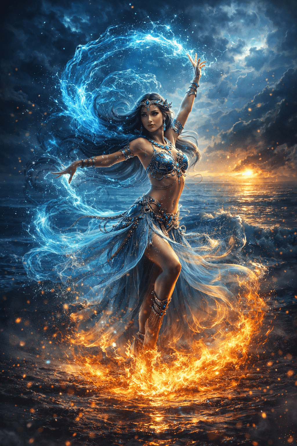 A cinematic fantasy poster of an elemental dancer on a shoreline at twilight. A graceful woman performs a powerful dance, her body surrounded by flowing water and glowing fire. Blue, ethereal water energy spirals around her hair and arms, while golden flames ignite beneath her feet, blending fire and water in perfect balance. She wears ornate, flowing dance attire with translucent fabrics, intricate beadwork, and turquoise jewelry inspired by ancient and mystical cultures. Her pose is elegant and dynamic, one arm raised, the other extended, controlling the elements with fluid motion.