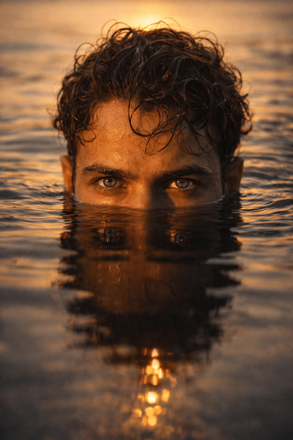 A close-up photograph of a person’s head emerging from the water, with the water level exactly at their nose. Their intense green eyes are looking directly at the camera, and their wet, curly brown hair is plastered against their forehead. The reflection of their eyes and nose is visible on the surface of the dark, rippling water. The lighting is golden hour, creating strong highlights and shadows. Quality 8k size 4 5 ratio 100% use my upload reference image image generate