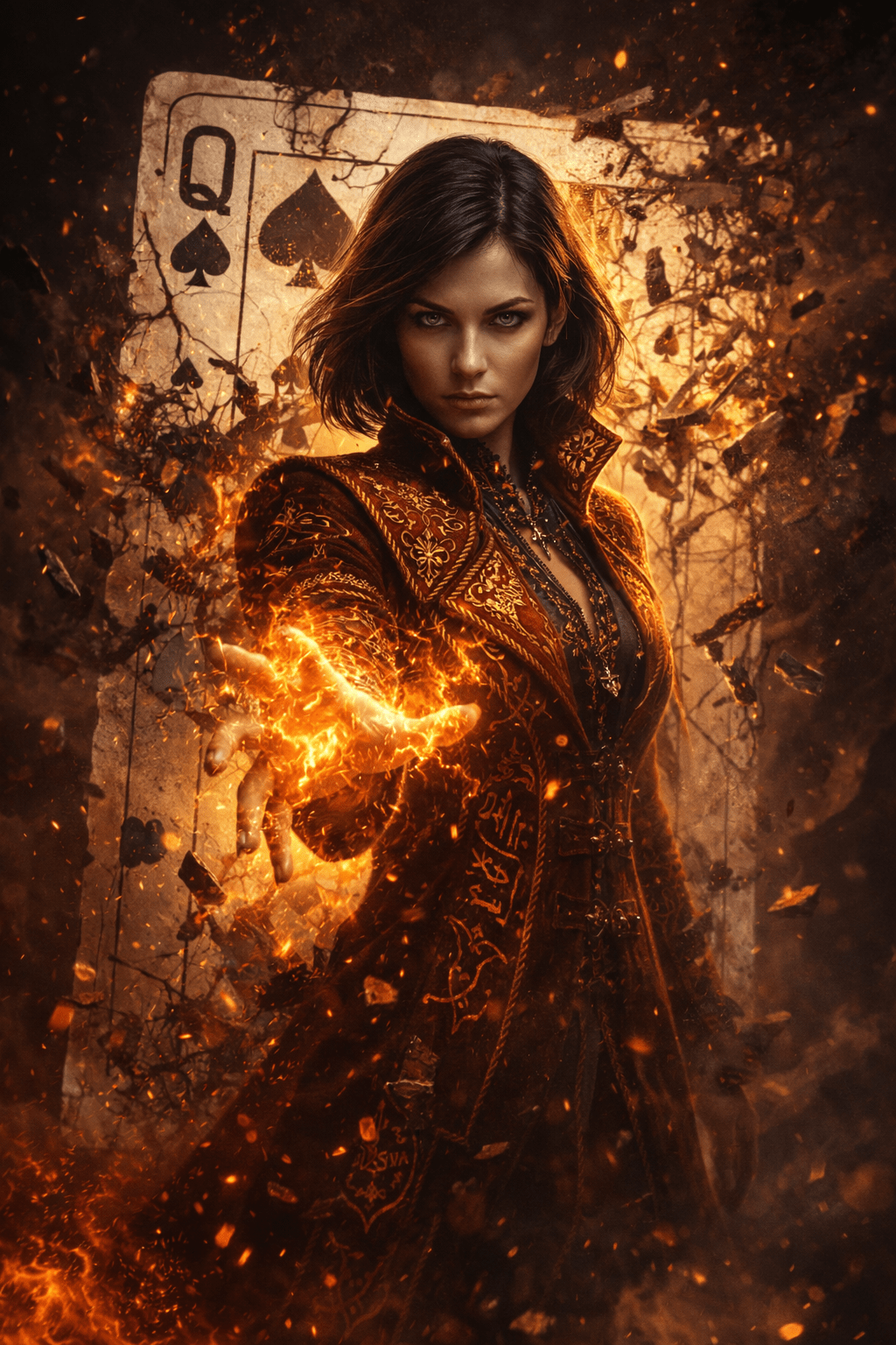 A cinematic fantasy poster of a powerful mystical woman emerging from a shattered Queen of Spades playing card. She has striking, realistic facial features, intense eyes, and shoulder-length dark hair. She wears an ornate deep-red velvet coat embroidered with gold runic symbols and royal patterns. One hand is extended forward, glowing with golden magical energy swirling around her fingers like arcane light. The playing card behind her is cracked and broken, debris flying outward in slow motion. Dark, smoky background with dramatic lighting, dust particles, and motion blur. Ultra-detailed, hyper-realistic, sharp focus, epic fantasy vibe, dark color grading, cinematic depth of field, high contrast, 8K quality, poster art, concept art style, dramatic atmosphere.