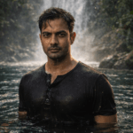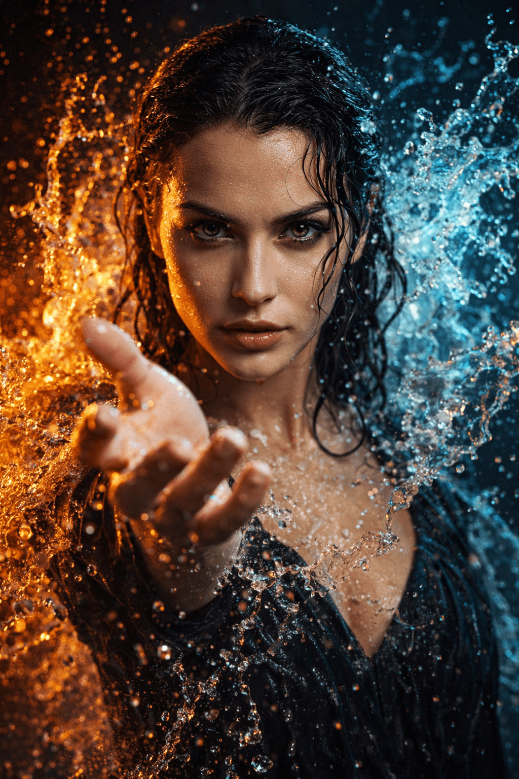 A close-up portrait of a woman with wet, dark hair, her face and shoulders covered in splashing water and golden fire-like liquid. Her right hand is reaching forward towards the viewer, fingers slightly curled. Her intense gaze is directed at the camera. The liquid elements create a chaotic burst around her, with warm orange and gold tones on the left and cool blue and teal tones on the right. She wears a dark, textured top. The lighting is dramatic and high-contrast, capturing every droplet and wave quality 8k Size 4:5 ratio image generate