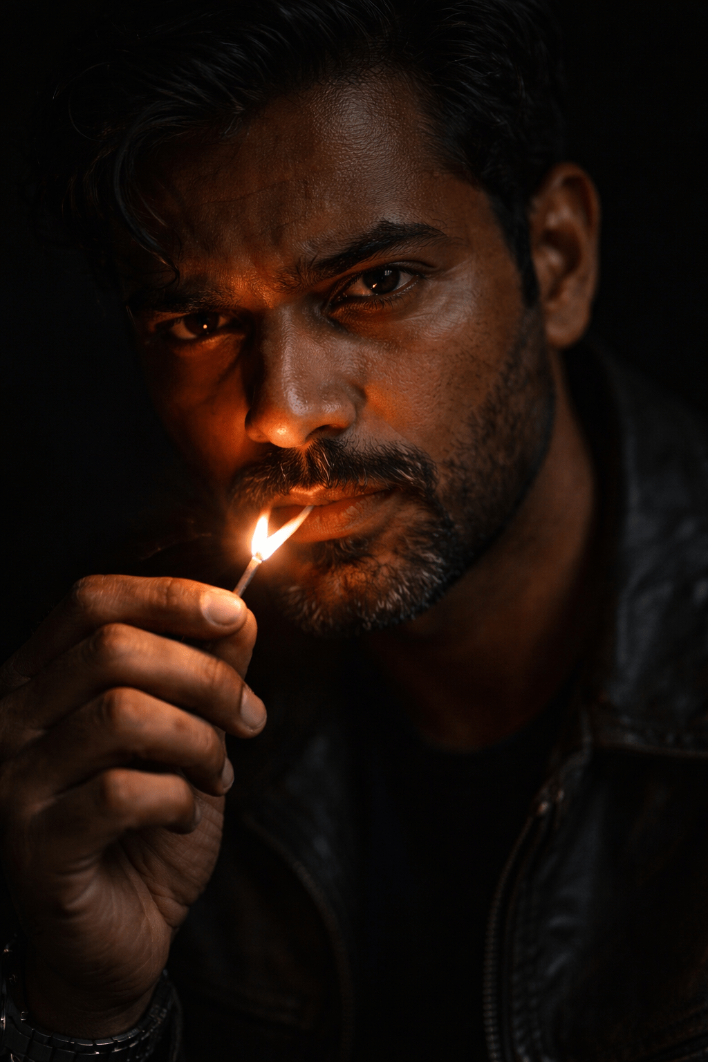 Ultra-realistic close-up portrait of a rugged middle-aged man with moustache and beard, intense serious expression, holding a burning matchstick near his lips, warm flame light illuminating one eye and half face, dark black background, dramatic cinematic lighting, sharp skin texture, high contrast, photorealistic. Size 4 5 ratio image generate