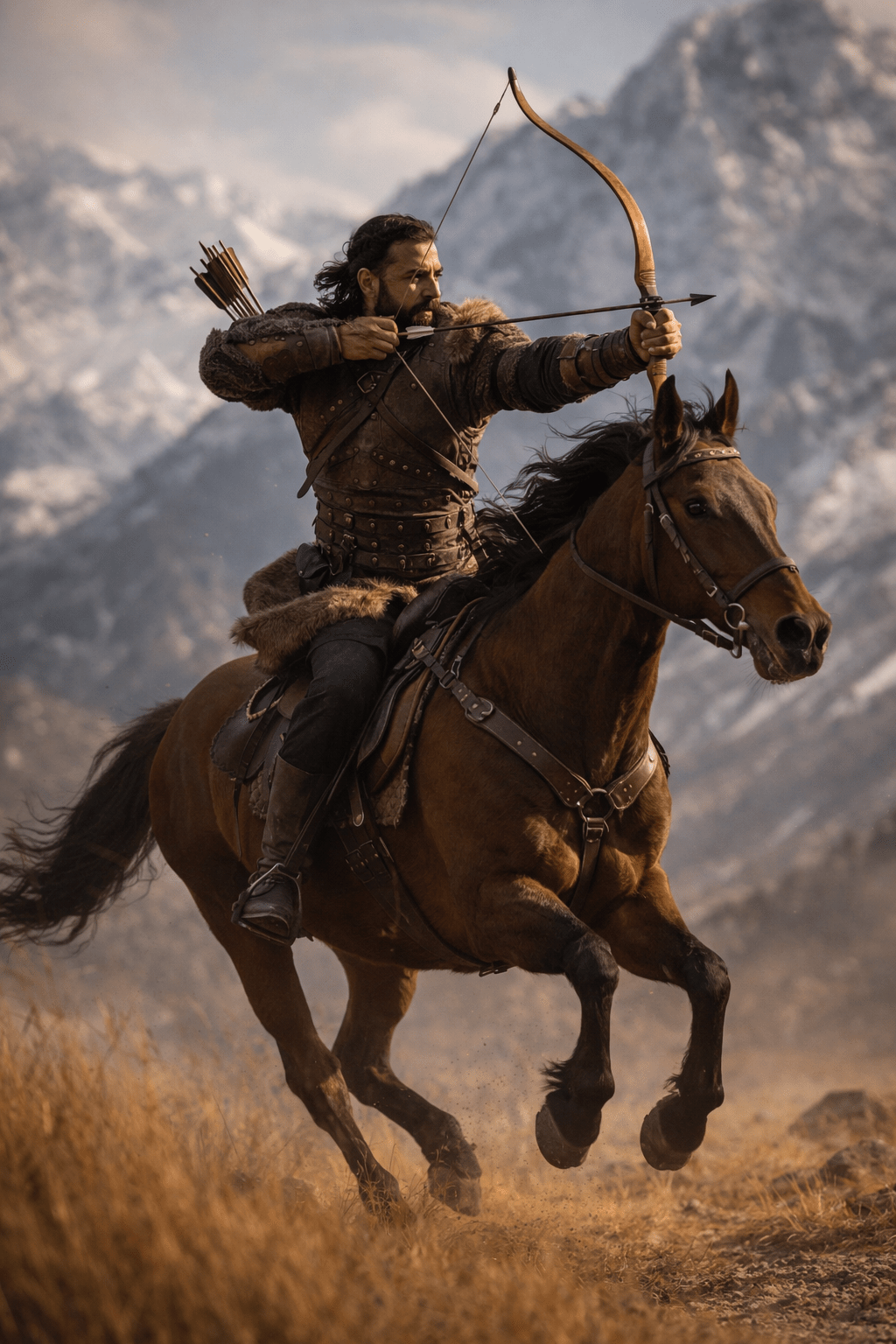 Ultra-realistic cinematic fantasy scene of a rugged warrior archer riding a galloping horse, captured mid-motion. The man is seated firmly in the saddle, body turned slightly left, drawing a traditional wooden bow fully stretched, aiming to his right side. His left arm extended forward holding the bow, right arm pulled back to his cheek holding the arrow. He wears fur-lined leather armor, braided hair, thick beard, quiver on his back. Horse in full stride, front legs lifted. Snow-covered mountains blurred in the background, golden grass foreground, shallow depth of field, dramatic natural light, hyper-detailed textures, 8K realism, cinematic photography. Size 4 5 ratio image generate