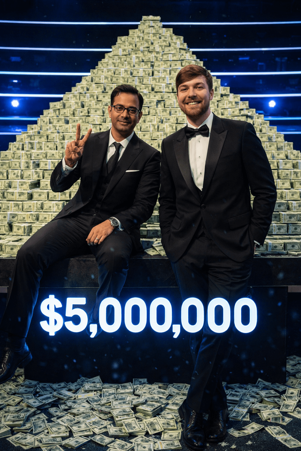 Based on image_0.png, the scene shows two men posing with a massive pile of cash. On the left, a man in a black suit and glasses (labeled “your”) sits on the platform edge, making a peace sign with his right hand. On the right, a man in a black tuxedo (MrBeast) stands and smiles at the camera. They are in front of a huge pyramid of green dollar bills, with more bills scattered on the floor. Below them is a large illuminated sign reading “$5,000,000” in blue neon. The background is a game show stage with blue horizontal lights. Size 4 5 ratio Quality 8k 100% use my upload reference image image generate