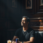 Generate a portrait of a young man sitting on the front sofa of the Kapil Sharma Show set next to him Shraddha kapoor sit, Kapil Sharma sitting on left sofa as he ask him question. Both look towards the kapil sharma slightly. A Table front of them with keep fruits on it, Bright Lighting, Shot from front, Young man wear striped printed zip neck cotton blend full sleeve oversized black tshirt and white baggy pant with sports shoes,Textured facial details, swallow depth of field, 35mm shot. 100% use my upload reference image image generate
