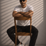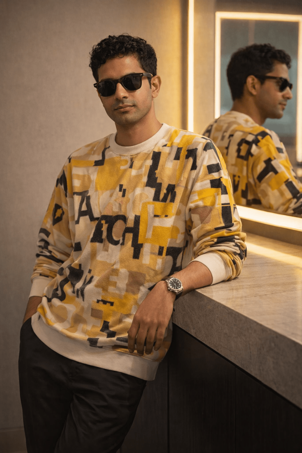 He is wearing a long-sleeved crewneck oversized shirt with an abstract pattern of beige, yellow, and black blocks and letters.he also has on dark trousers and a watch on his left wrist. The mirror behind him has an illuminated frame, and his reflection is visible in the upper right corner. Wear black sunglasses. And I don’t have a beard 100% use my upload reference image image generate