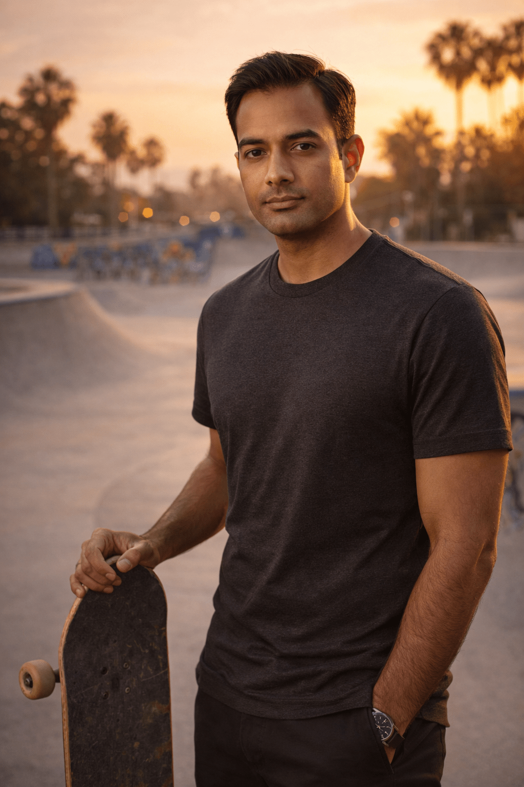 Ultra-realistic cinematic portrait, 8K resolution, vertical 4:5 composition. A confident young man standing at a concrete skatepark during golden hour sunset. Medium-close framing from waist up, body slightly angled sideways while face turned toward camera. Calm serious expression, sharp jawline, natural skin texture, thick styled dark brown hair swept back, defined eyebrows, clean light stubble. Wearing a fitted plain charcoal-gray crew-neck T-shirt highlighting athletic build. One hand naturally holding a skateboard vertically beside his body. Background shows smooth curved skate ramps with colorful graffiti walls, soft bokeh palm trees and outdoor park atmosphere. Warm natural sunlight casting soft highlights on face and arms, shallow depth of field, cinematic color grading, highly detailed textures, realistic shadows, professional DSLR photography style, crisp focus, photorealistic finish.