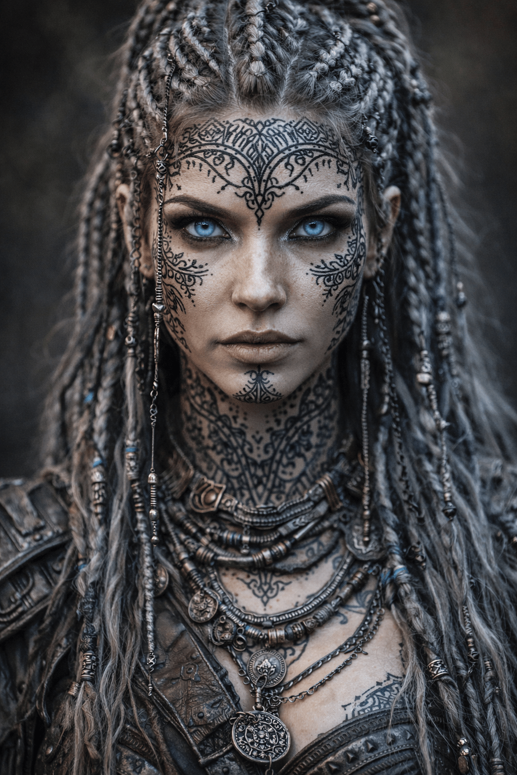 “A fierce, ethereal warrior woman with pale skin and icy blue eyes, intricate black ornamental tattoos covering her face, neck, and body in Nordic and tribal patterns. Her silver-gray hair is styled in tight, elaborate braids adorned with beads, metal rings, and delicate jewelry strands that drape along her face. She wears layered metallic and leather adornments with ancient, ceremonial detailing. Cinematic fantasy portrait, hyper-realistic, ultra-detailed skin texture, sharp focus, shallow depth of field, soft natural lighting, muted earthy background, moody atmosphere, high contrast, 8k resolution, fantasy realism, dark nordic aesthetic.”