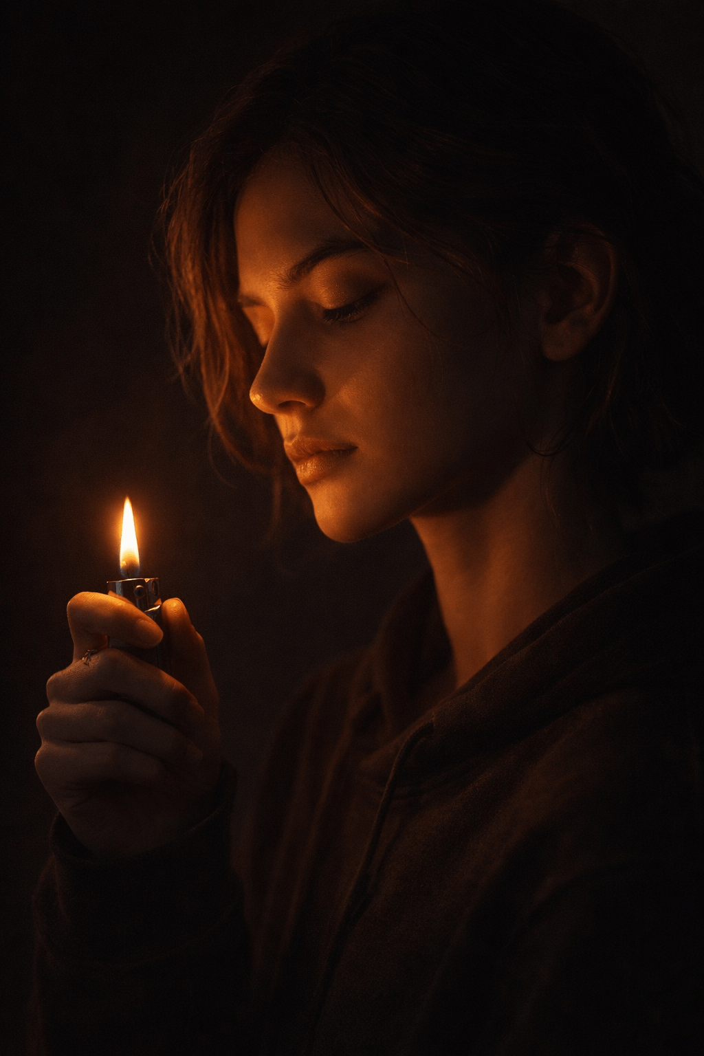 Ultra-realistic low-light portrait of a young person holding a lit lighter close to their face, three-quarter angle pose, calm serious expression, eyes softly focused toward the flame, warm orange firelight illuminating facial features, deep shadows, dark moody background, cinematic chiaroscuro lighting, shallow depth of field, high detail skin texture, intimate atmosphere. Size 4 5 ratio image generate.
