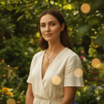 Woman wearing gold pendant in lush green garden