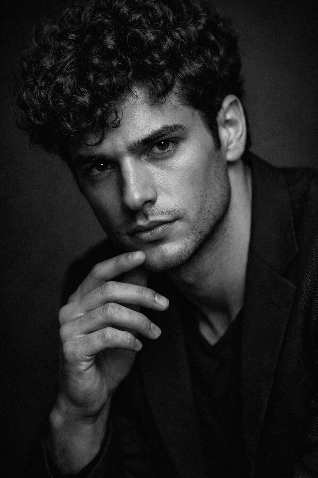 “Ultra-realistic black and white cinematic close-up portrait of a young man with thick curly textured hair, leaning slightly forward toward the camera. His right hand is raised near his chin with two fingers softly touching the jawline in a thoughtful pose. Intense direct eye contact, neutral serious expression, soft lips, sharp nose structure. Wearing a dark formal blazer, minimal styling. Low-key studio lighting with soft diffused light from the front-left, deep shadows on the right side of the face. Dark plain background, high contrast monochrome tones, sharp skin texture, subtle film grain, shallow depth of field, professional studio photography, 85mm lens feel, ultra-realistic, 8K quality, vertical 4:5 composition image generate