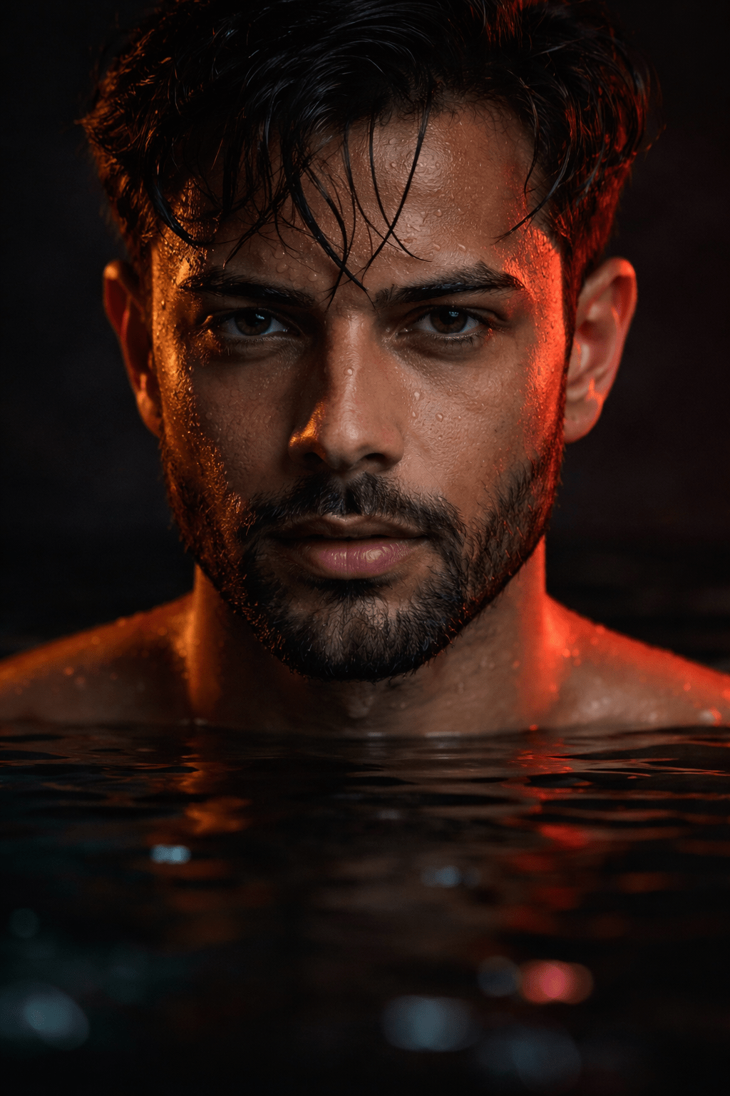“Ultra-realistic cinematic close-up portrait of a bearded young man half-submerged in dark water, waterline cutting across his lips and chin, intense direct eye contact with the camera, wet hair falling on forehead, skin covered with water droplets. Dramatic split lighting with teal light on one side of the face and red light on the other, dark moody background, sharp facial texture, shallow depth of field, 8K quality, vertical composition.” size 4 5 ratio image generate