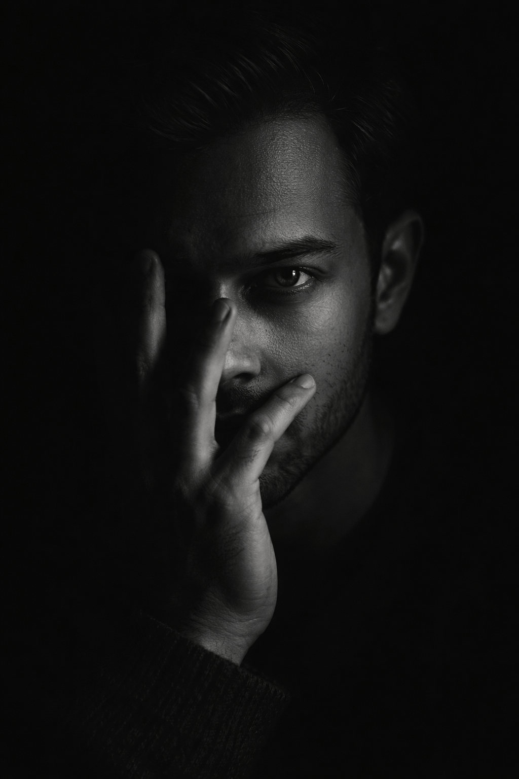 Ultra-realistic black-and-white low-key portrait of a young man partially hidden in darkness, intense single eye visible staring at the camera, hand covering mouth and lower face, fingers pressed against cheek, dramatic side lighting, deep shadows, high contrast, moody cinematic atmosphere, minimal background, fine skin texture, emotional depth, 4:5 ratio. Image generate