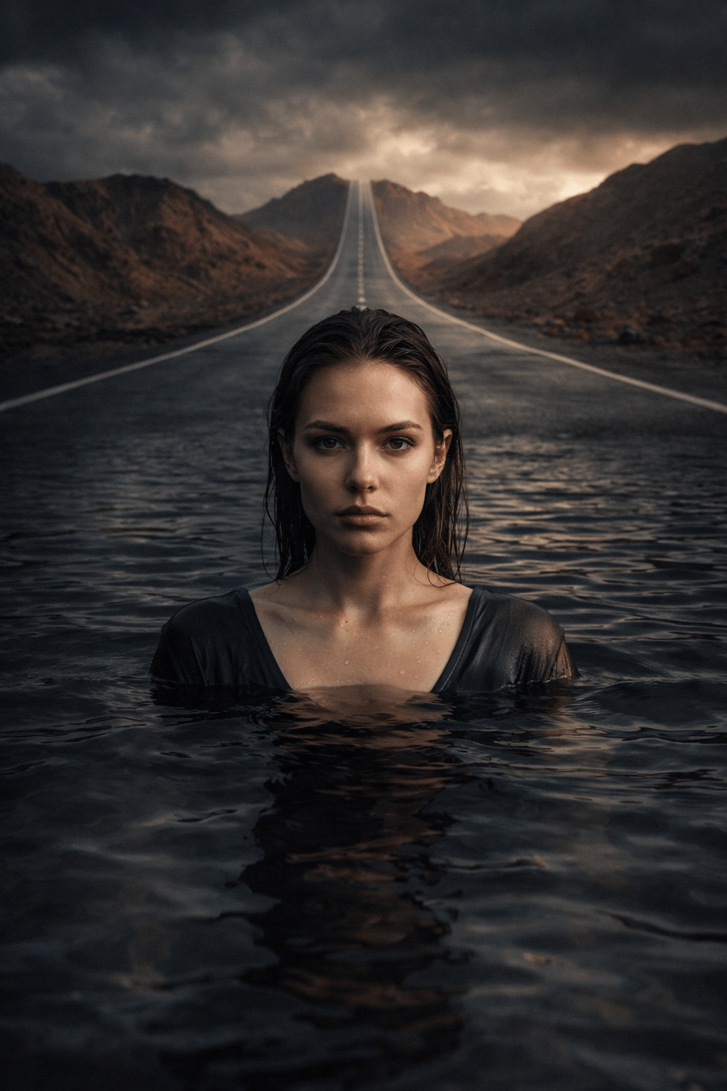 “Surreal cinematic scene of a young woman chest-deep in dark water, centered in frame, staring straight at the camera with a calm intense expression. A long empty asphalt road with white center lines rises directly behind her, stretching into brown mountains. Dramatic lighting, moody atmosphere, ultra-realistic, sharp focus, high detail, vertical composition. Quality 8k size 4 5 ratio 100% use my upload reference image image generate