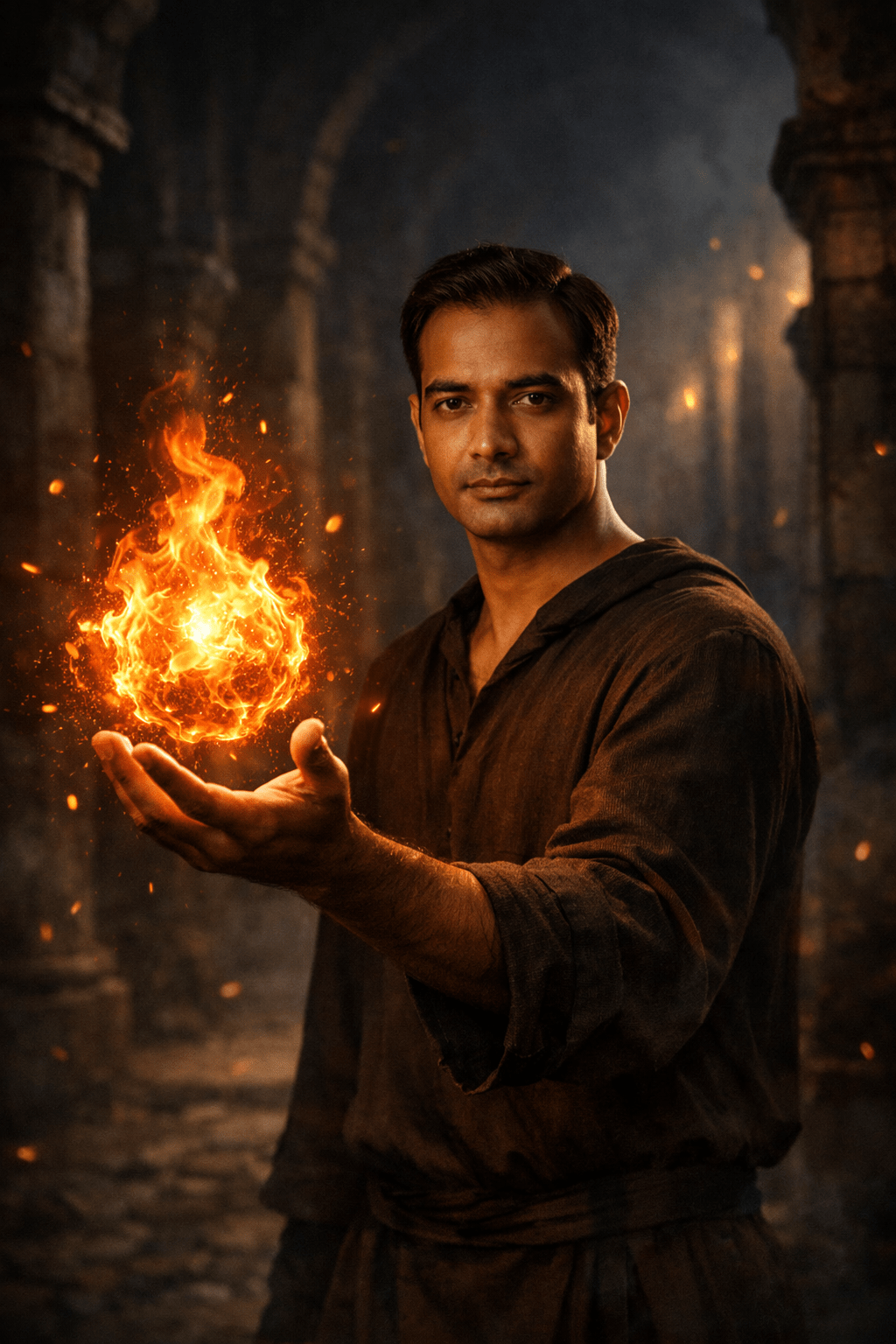 Lighting & mood: low-key cinematic lighting, strong warm key light from the fireball, cool dark blue ambient background, high contrast, soft rim light outlining his shoulders and head, volumetric light beams, dramatic and mystical mood.