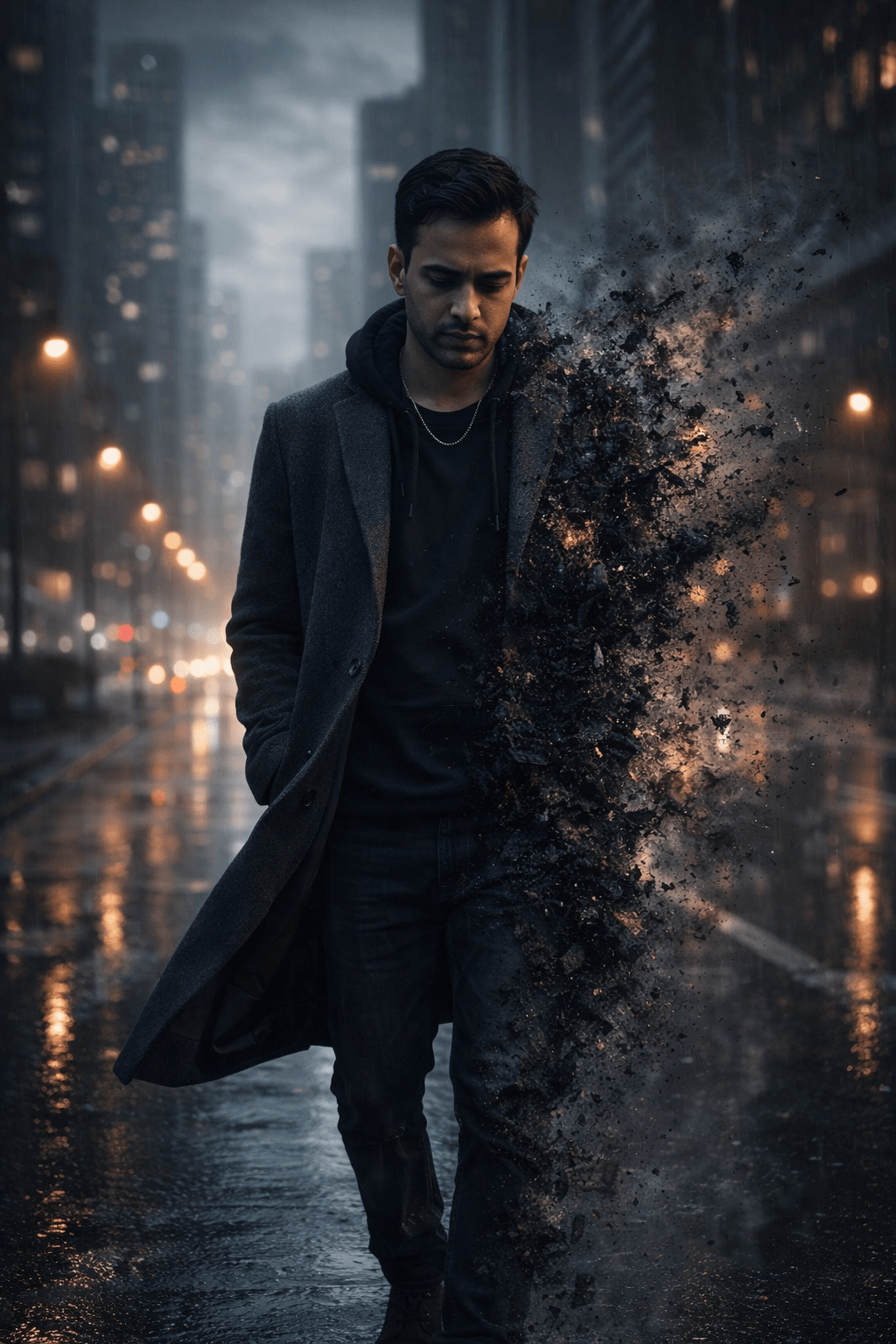 Lighting & mood: moody cinematic lighting, cool desaturated tones, soft highlights on face and coat, strong contrast between the solid human form and dissolving black particles, emotional, dark, dramatic, psychological tone.