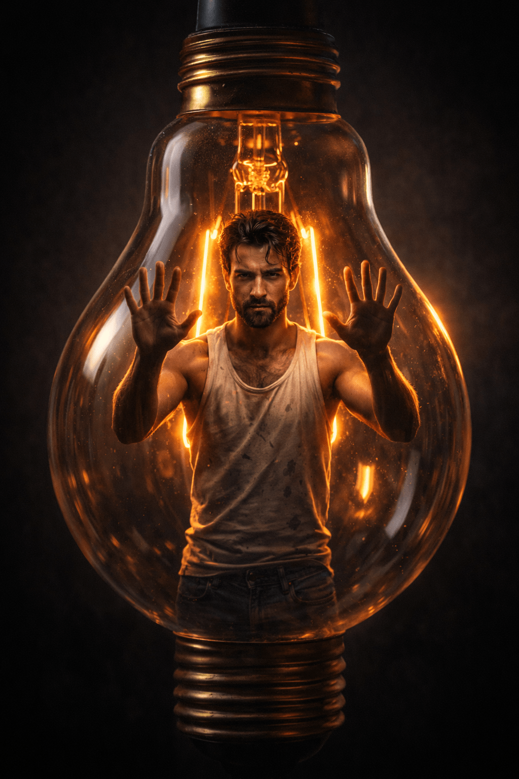“Ultra-realistic cinematic conceptual portrait of a fit young adult man trapped inside a giant transparent incandescent light bulb. He is standing upright inside the bulb, both palms pressed outward against the glass, fingers spread, as if trying to escape. He has styled dark hair, a sharp jawline, thick well-groomed beard, intense focused eyes, and realistic skin texture with sweat and subtle dirt marks. He is wearing a worn white sleeveless vest with small tears and stains, and blue denim jeans. His muscular arms and shoulders are clearly defined.