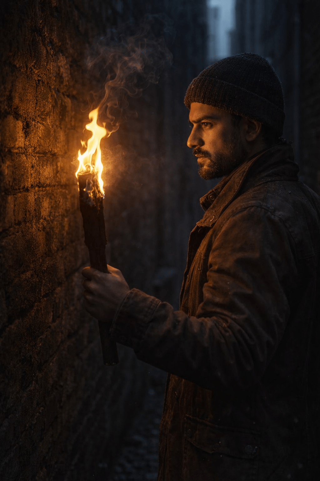 Ultra-realistic cinematic portrait of a rugged young man standing in a narrow dark alley, side-facing a moss-covered brick wall, holding a burning wooden torch forward at chest height. Focused intense expression, short beard, wearing a worn brown coat and dark beanie. Warm firelight illuminating his face and wall, smoke swirling upward, deep shadows, moody atmosphere, shallow depth of field, dramatic low-light photography, 4:5 ratio. Image generate