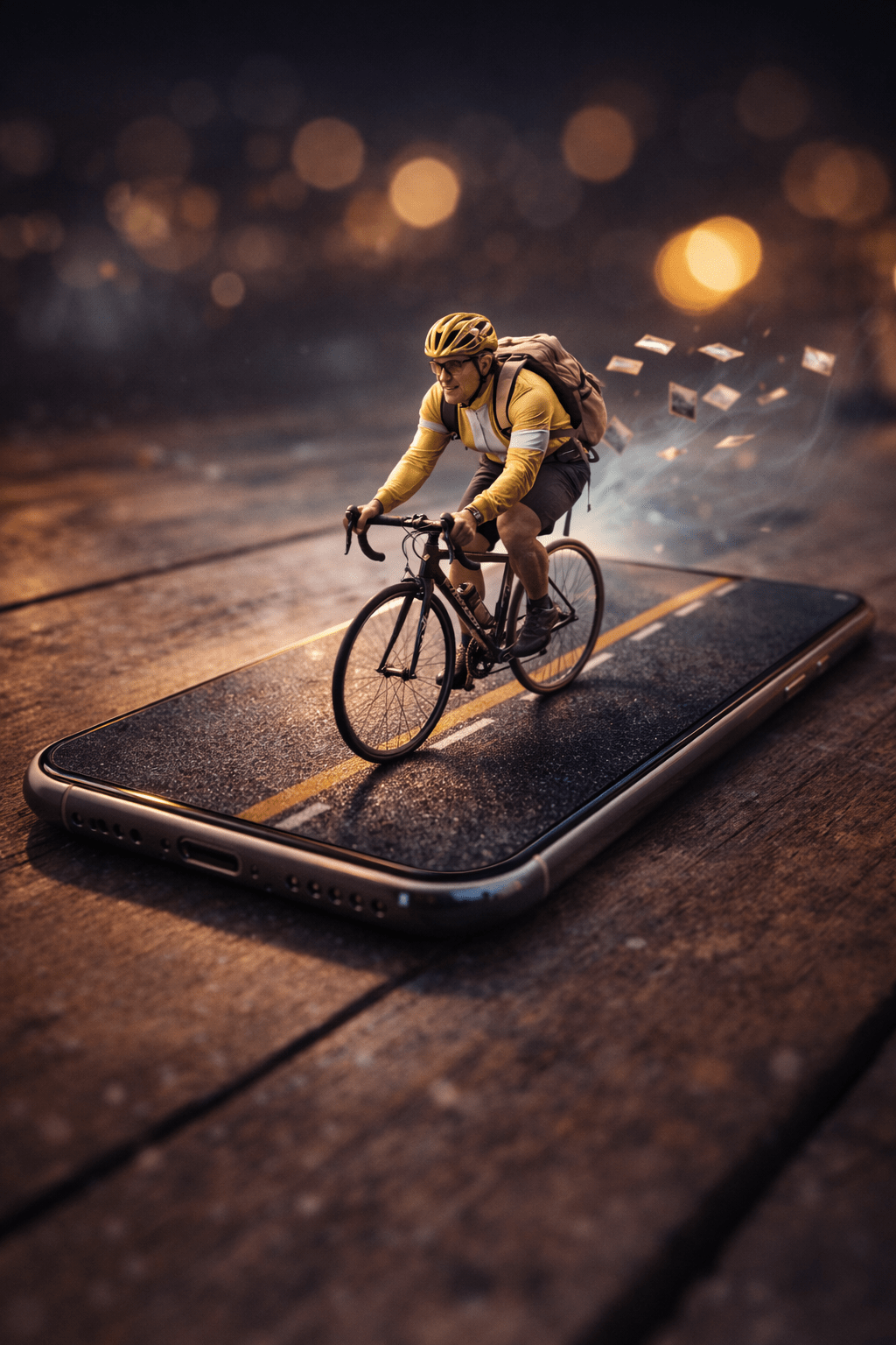 A hyper-realistic, 8k, low-angle wide-shot, captured with a wide-angle lens and shallow depth of field, depicts a surreal scene with cinematic lighting. A modern smartphone, featuring a dark screen and subtle rose gold edges, lies flat on a highly detailed, weathered dark wooden plank surface, which recedes into a softly blurred background with bokeh light orbs. The phone’s screen displays a hyper-realistic image of a dark asphalt road with distinct orange and white lane markings, creating the illusion of a miniature highway. A miniature person, disproportionately small relative to the phone, is depicted riding a black road bicycle directly on the surface of the phone screen, with their wheels seemingly touching the digital road, and their upper body extending above the phone’s physical plane. The cyclist is actively pedaling, leaning forward, wearing a bright yellow cycling helmet, a yellow and white long-sleeved cycling jacket, dark cycling shorts, and a large, light-colored backpack with multiple visible straps; the character’s face is to be rendered using uploaded face as reference. Behind the cyclist, several small, rectangular photographs or papers are depicted mid-air, flying out from the backpack, creating a dynamic trail, along with a faint, light-colored streak. The scene is illuminated with soft, diffused cinematic lighting, creating subtle reflections on the phone screen and highlighting the highly detailed textures of the wood and the cyclist’s gear, with a subtle motion blur on the bicycle wheels and flying papers to emphasize movement and speed. The composition employs a forced perspective to achieve this unique scale and spatial relationship.