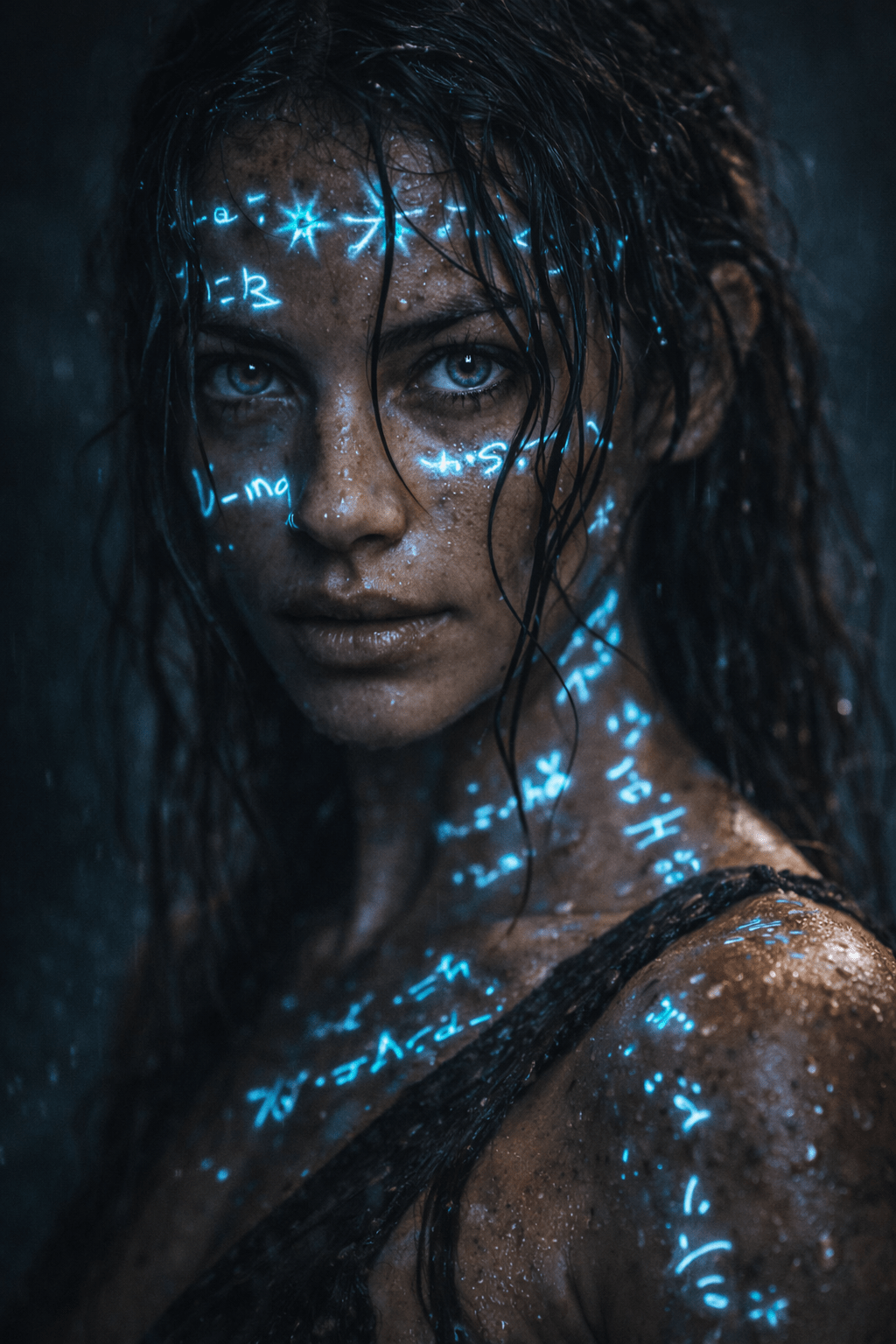 “Ultra-realistic cinematic close-up portrait of a young woman facing the camera directly, intense light green-blue eyes, wet messy dark hair falling across her face, rain-soaked glowing skin. Calm but powerful expression, lips slightly parted. Neon blue glowing handwritten symbols and words projected across her forehead, cheeks, neck, and shoulder. Dark moody background, dramatic low-key lighting, strong highlights on wet skin, shallow depth of field, sharp focus on eyes, 85mm lens look, hyper-detailed skin texture, futuristic cinematic atmosphere, 8K, vertical composition.” size 4 5 ratio image generate